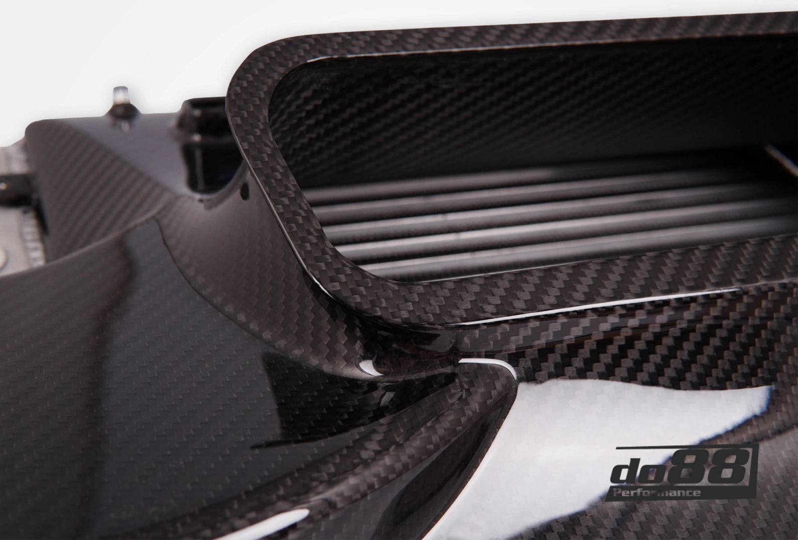 If you ask us, this is as good as you can make an intercooler kit for this platform. No rock has been left unturned in our quest for maximum performance in any given section of the system. The starting point is the cores from renowned Garrett Motorsport, these are incredibly well-made with thin and stacked fins, exactly according to our specification in the weighing of cooling and airflow. The end tanks are made from thin, cast aluminum to keep the weight down and still utilize airflow. To accommodate the thicker core, we replace the air guides with carbon ducts made from the best quality! And to remove bottlenecks throughout the system, the intercooler connections are made bigger and come along with do88 silicone hoses designed with soft, sweeping bends. We have not made any sacrifice or compromise during this development – behold the results!