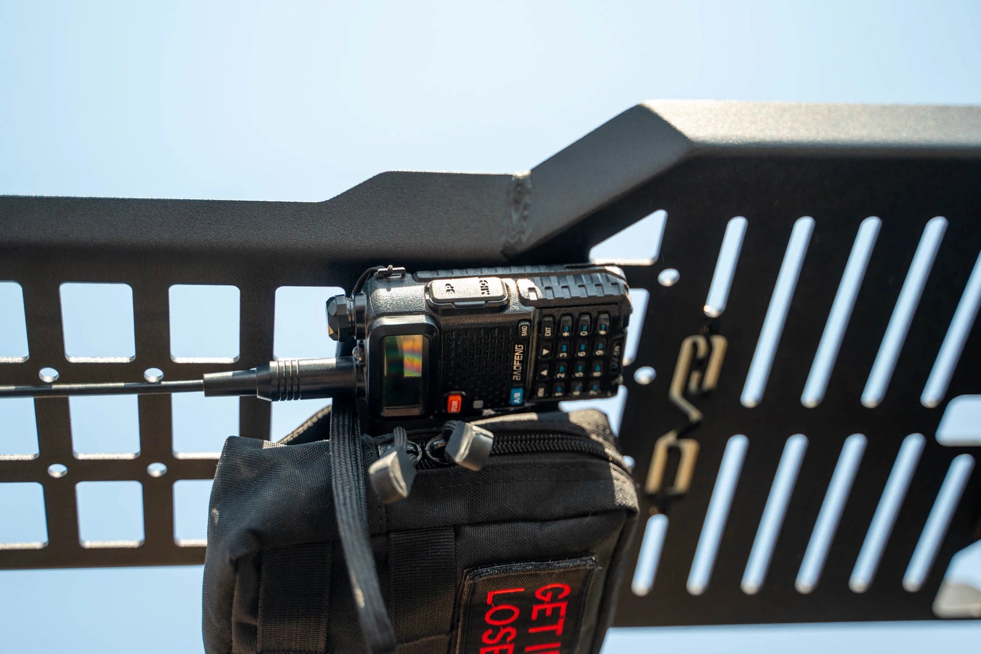 Our Bronco molle system is perfect for molle bags, CB or race radios, phone/tablet holders, gun holsters, knife sheaths, and any other gear you want on the road or trail. The top of the panel is flared, enabling you to stow small items like blankets, bags, and other gear. The 1-inch thick tube can be used as a rear grab handle or as an additional mounting opportunity. Slotted holes in multiple locations can be used for things like Baja Designs dome lights or other accessories that have varying-width mounting points.